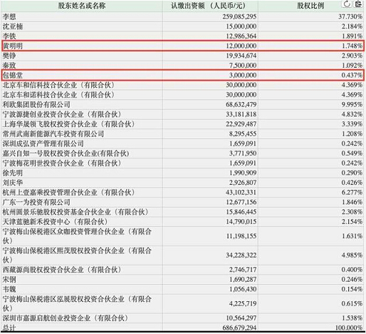 除了上述投資方,利歐股份兩次投資理想汽車所披露的信息顯示,其股東也包括一些個人企業(yè)家,比如華興資本CEO包凡的父親包錦堂、明勢資本創(chuàng)始人黃明明等。其中,明勢資本作為理想汽車唯一天使投資方,此后歷輪都追加投資,黃明明還自掏腰包,成為個人股東。