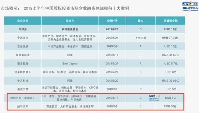 雖然理想汽車的本輪融資直到8月16日才官宣,但早在兩個月前,大概的投資金額及投資方已基本敲定。清科研究的數(shù)據(jù)顯示,2019上半年,在一級市場的所有行業(yè)中,汽車行業(yè)的融資案例和金額排名都不靠前,但由于汽車相關(guān)案例的單個融資額往往較大,因此在融資規(guī)模前十大案例中,理想汽車和威馬汽車均榜上有名。